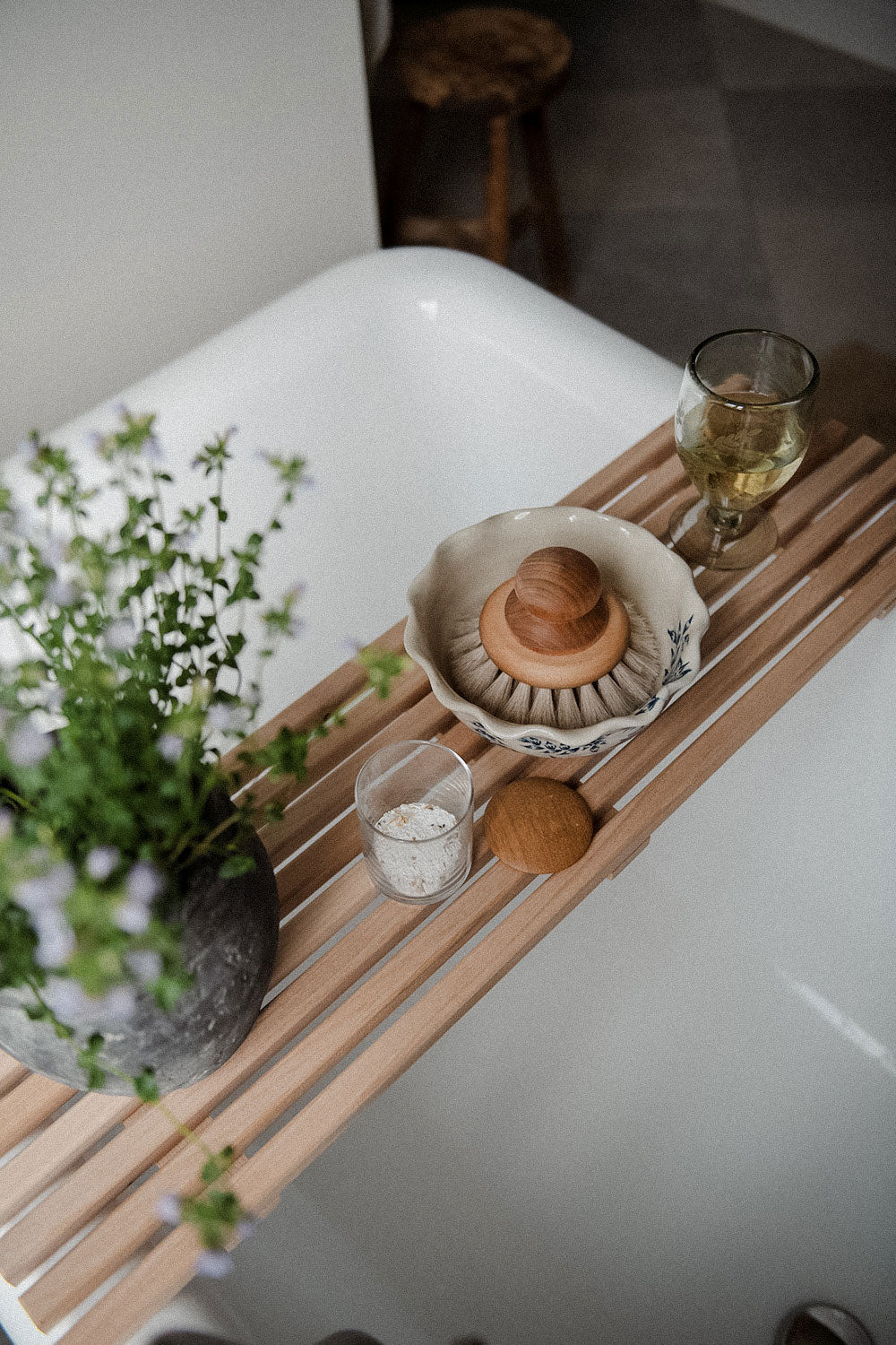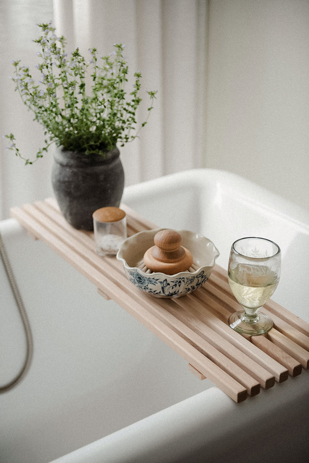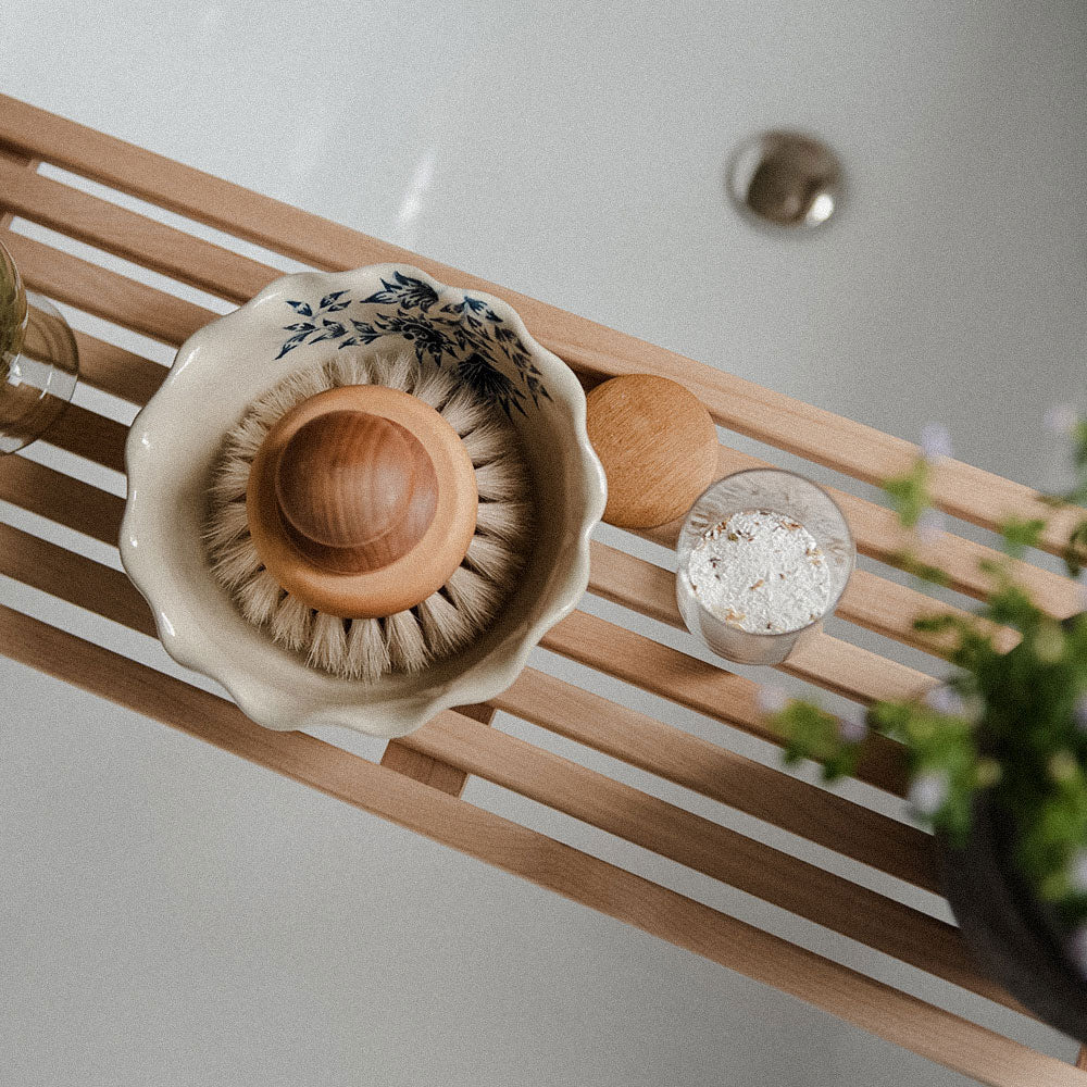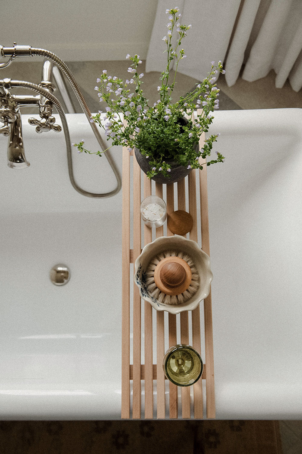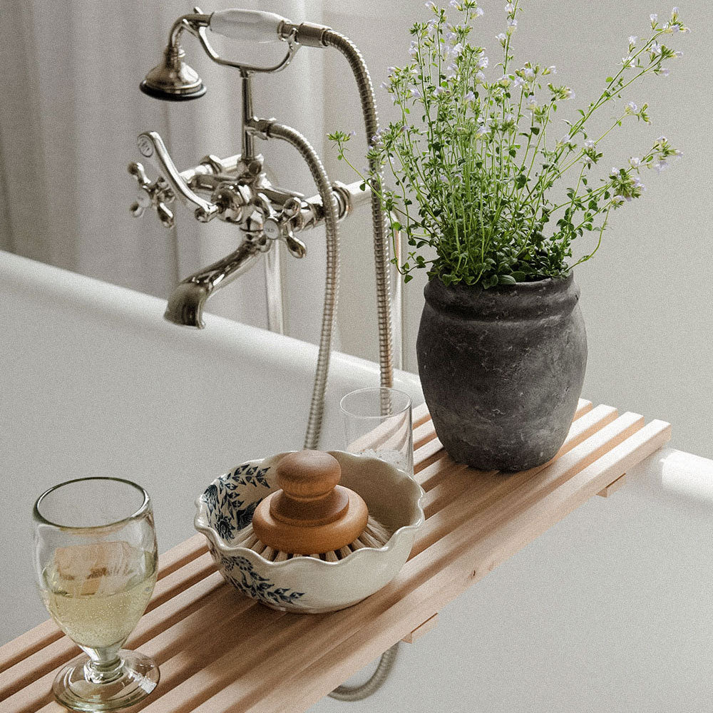 Crafted from repurposed red alder edge-trim scraps sourced from a local lumber mill, this slatted bath tray is as eco-conscious as it is beautiful. The open design allows water to drain easily, while the rich hickory finish adds warmth and texture to your bathroom. Precision-cut for a flat, stable surface — perfect for holding a book, candle, or drink during a soak. Bonus: it doubles as a stylish storage caddy when bath time is over.