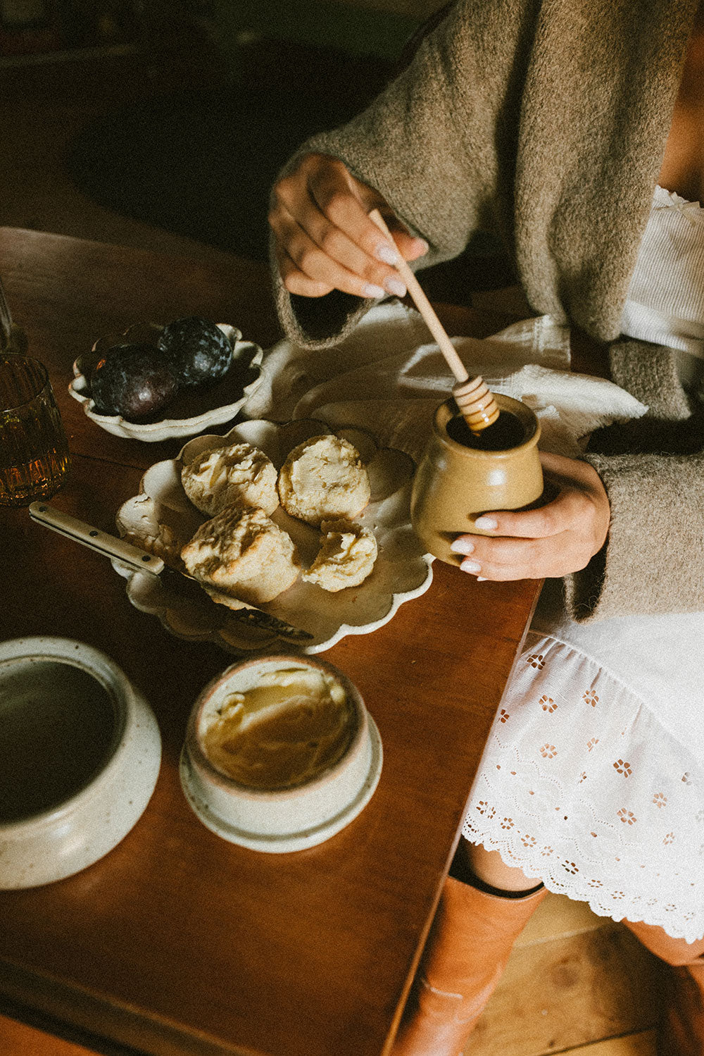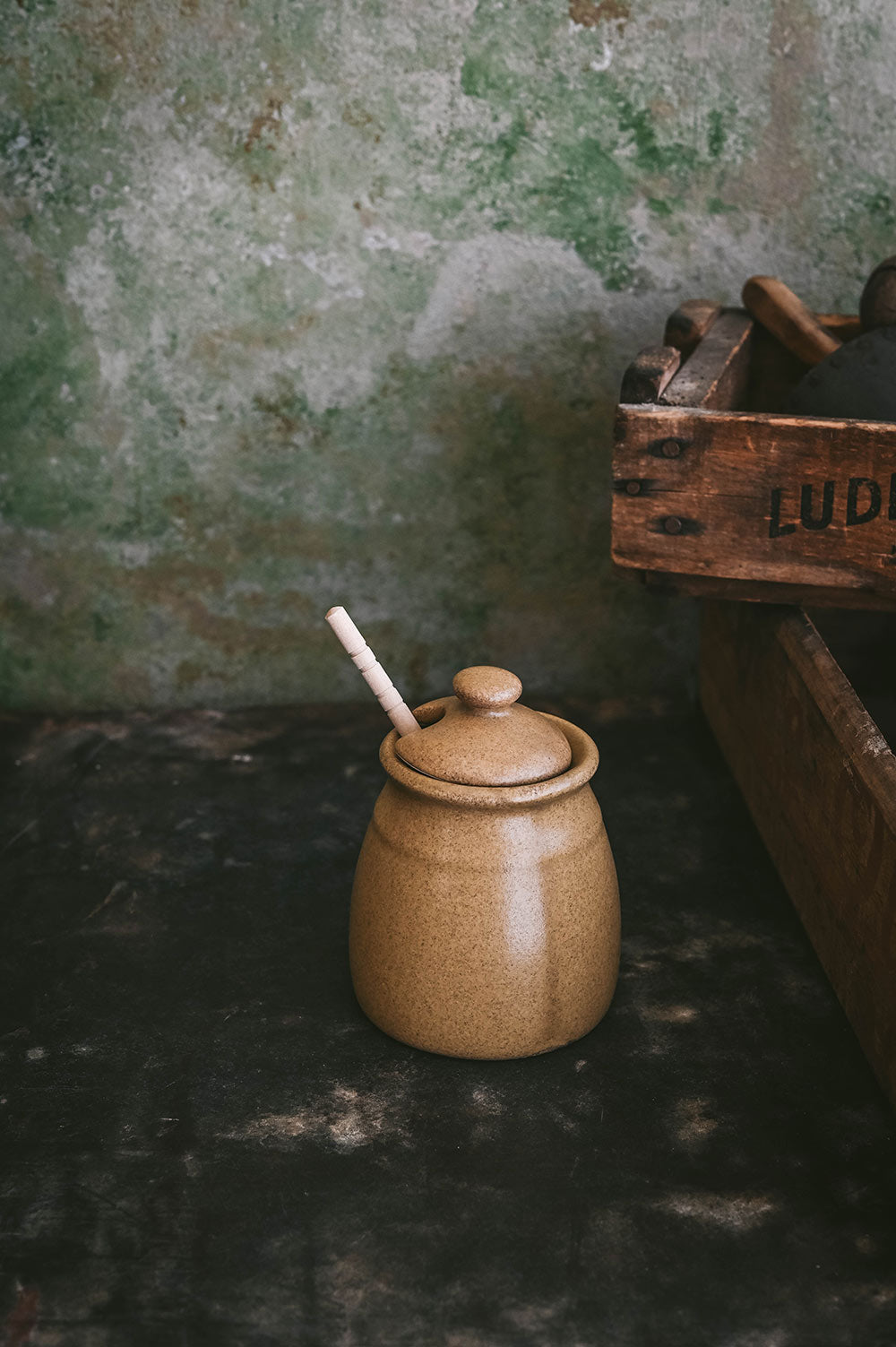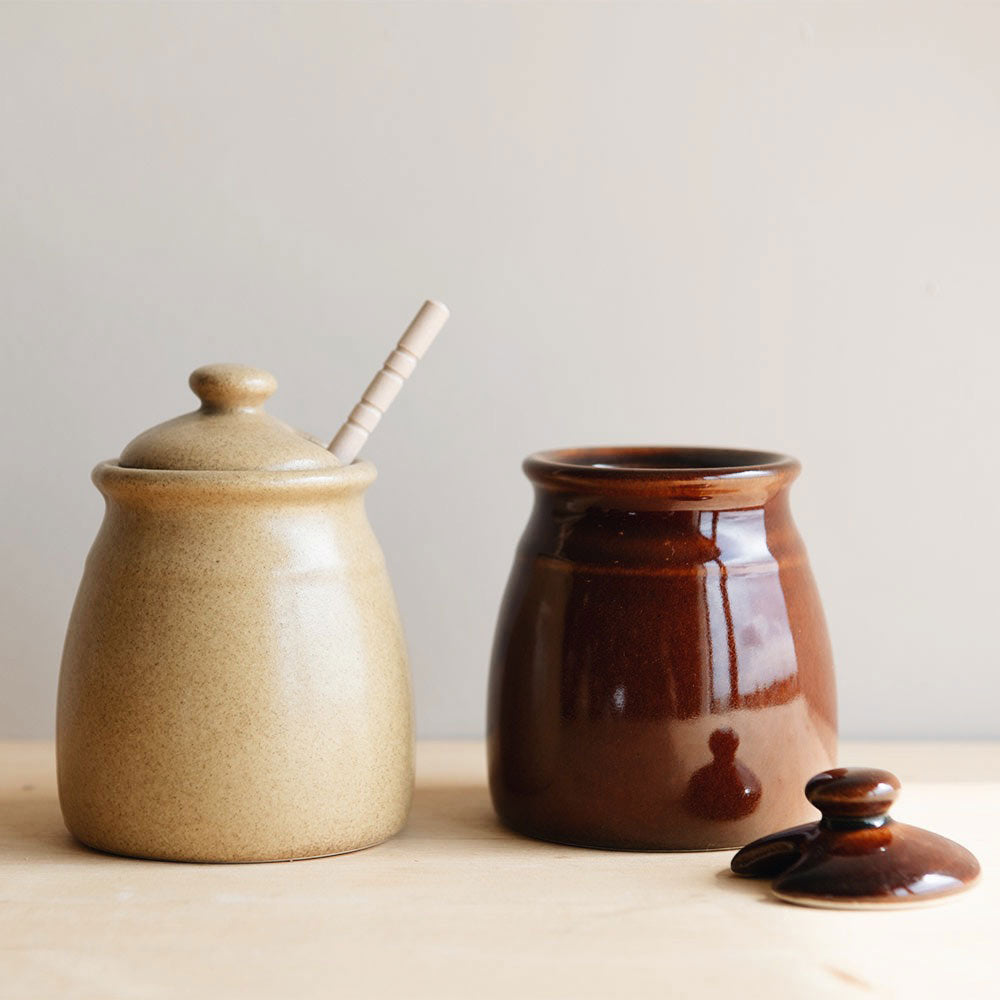 These charming honey pots are perfect for serving honey with morning tea, drizzling over toast, or keeping close by for everyday baking. It’s a piece that combines beauty and utility. A matching wooden dipper completes the set, making it as practical as it is pretty.
