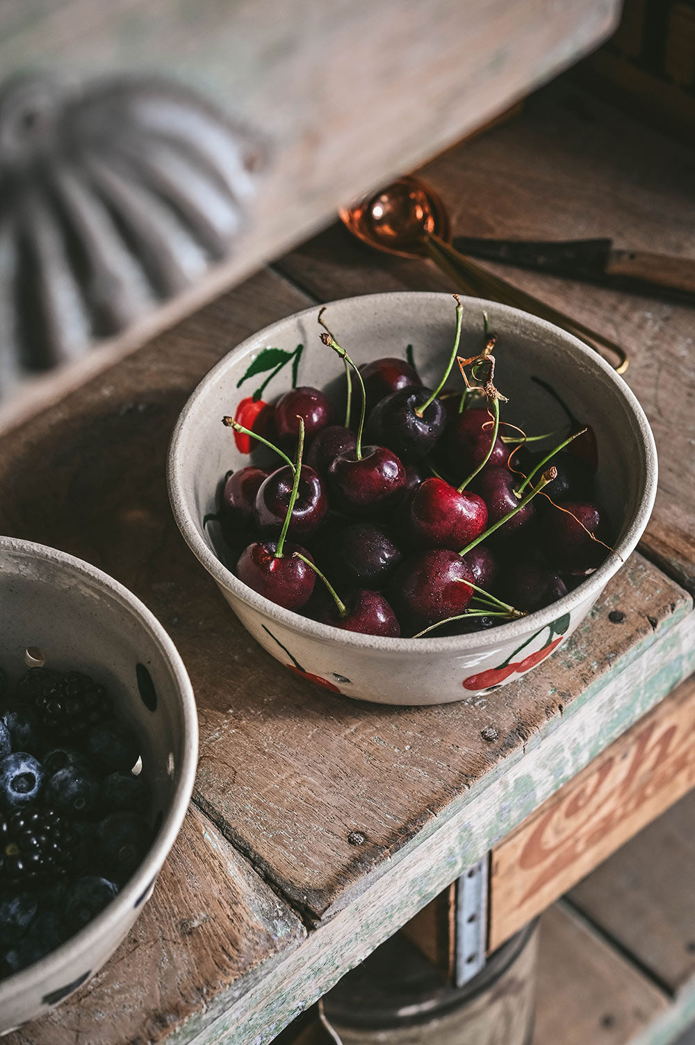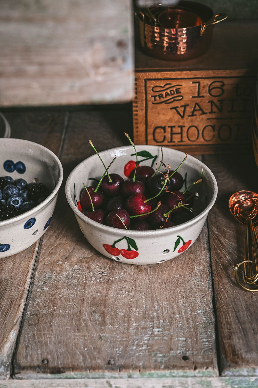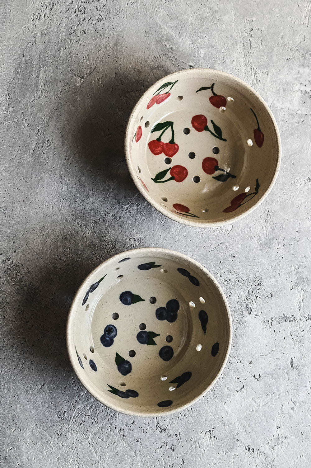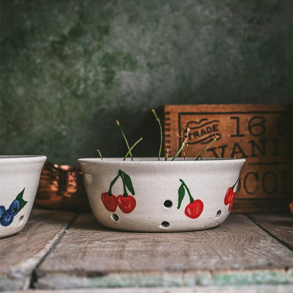 An adorable bowl made for rinsing fresh fruit from the garden. Hand-painted with scattered cherries, it has small holes for straining water and a flared lip that makes it easy to hold while rinsing. Hand-thrown in stoneware, each piece is both practical and playful. A sweet everyday staple and a thoughtful housewarming gift.