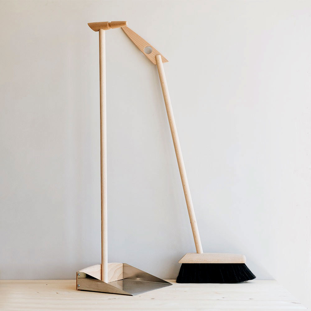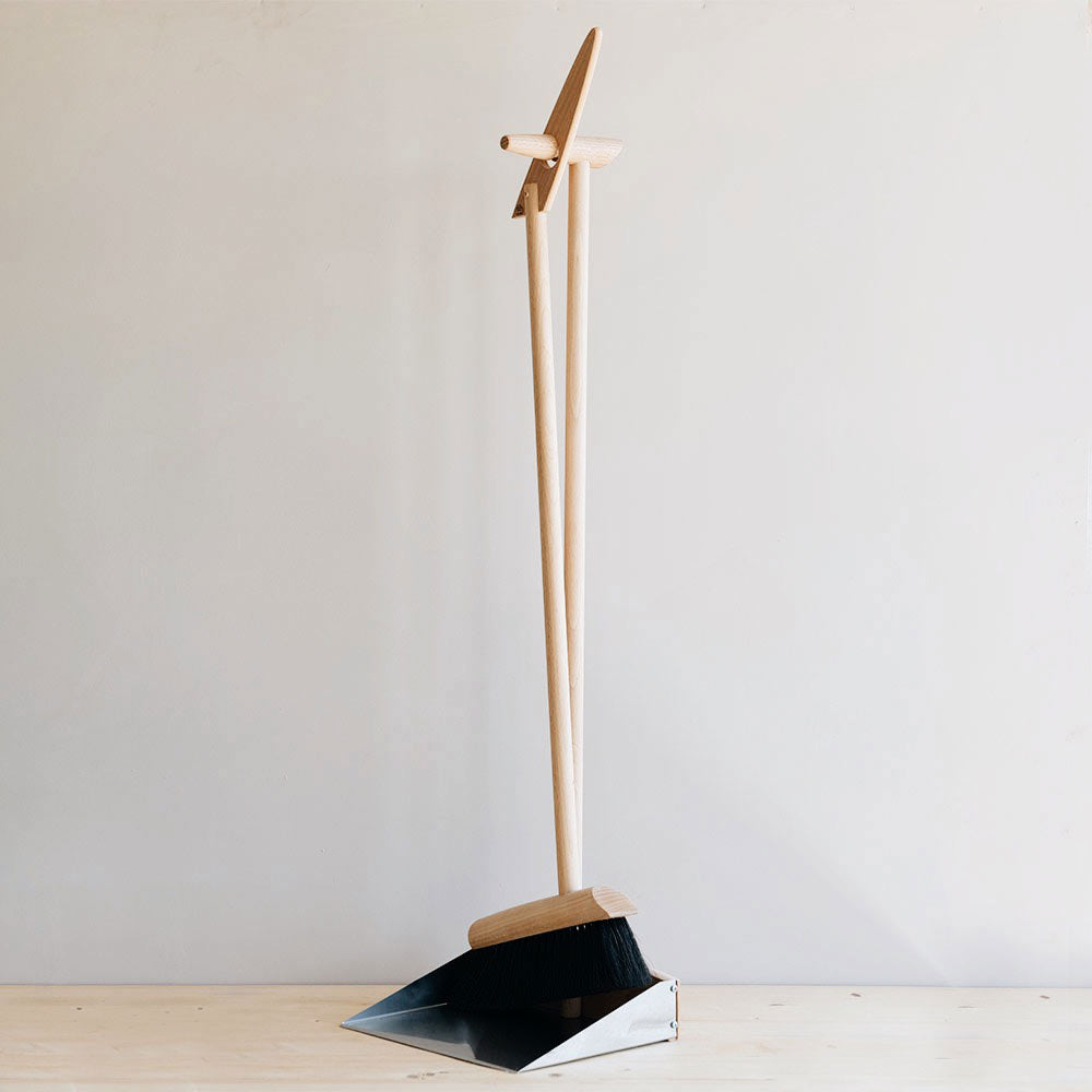 A beautifully crafted set featuring a long-handled beechwood and horsehair broom paired with a stainless steel dustpan.