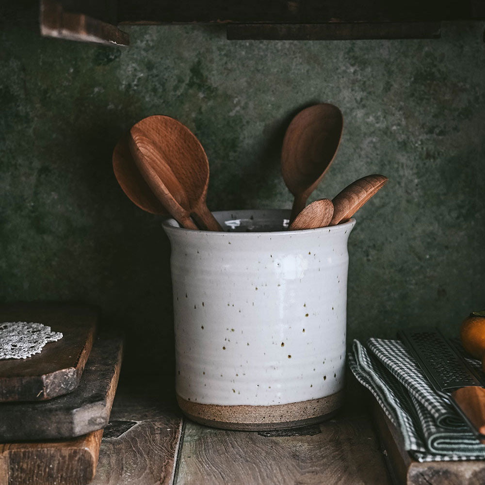 A multipurpose ceramic utensil jar with a soft speckled finish, hand thrown and hand glazed for a truly one-of-a-kind look. Perfect for holding kitchen tools, paint brushes, or fresh flowers. Microwave, dishwasher, and oven safe.