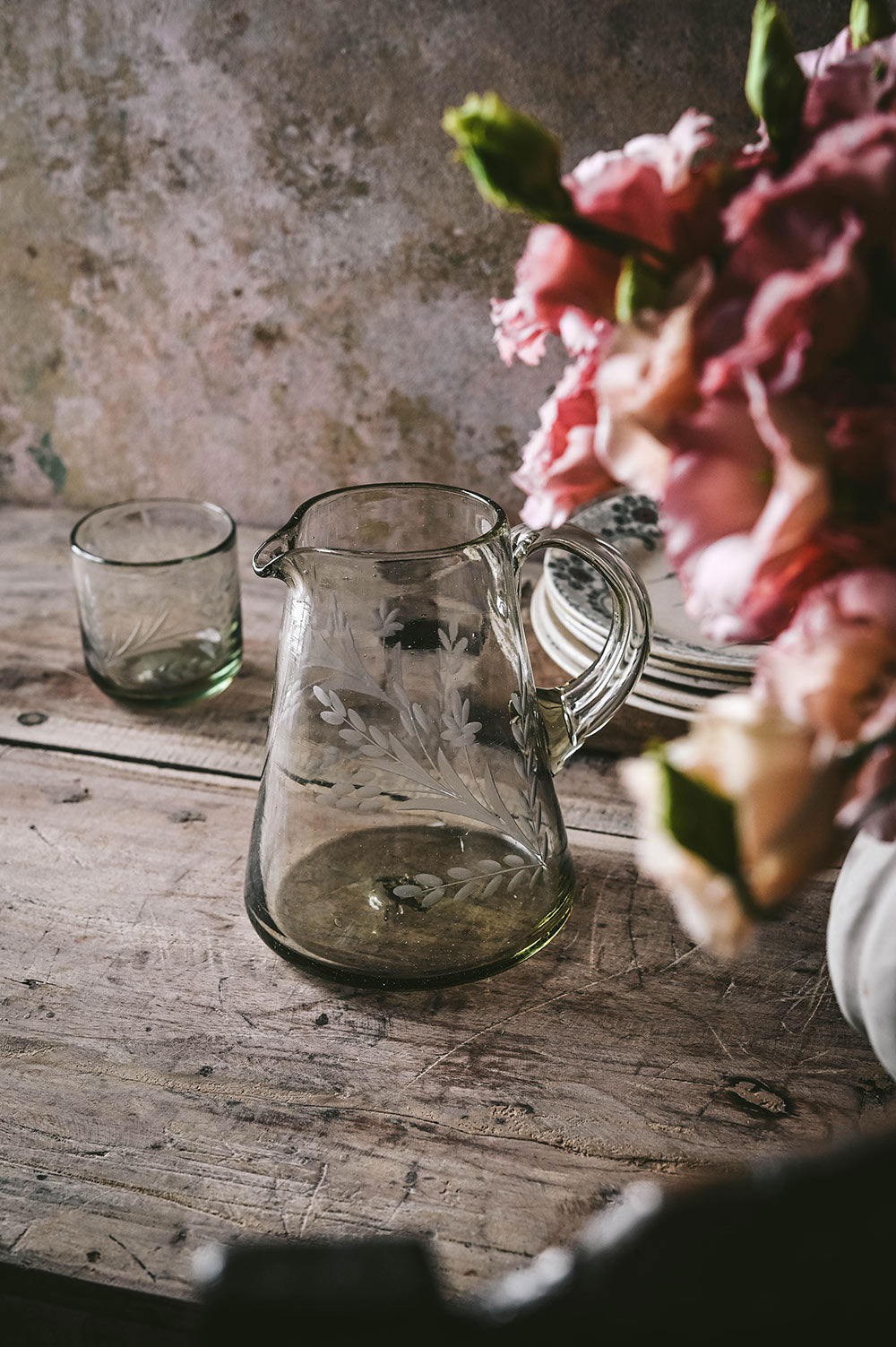 Elegantly crafted and eco-friendly, this flare pitcher is handblown from recycled glass and adorned with delicate etched floral patterns.