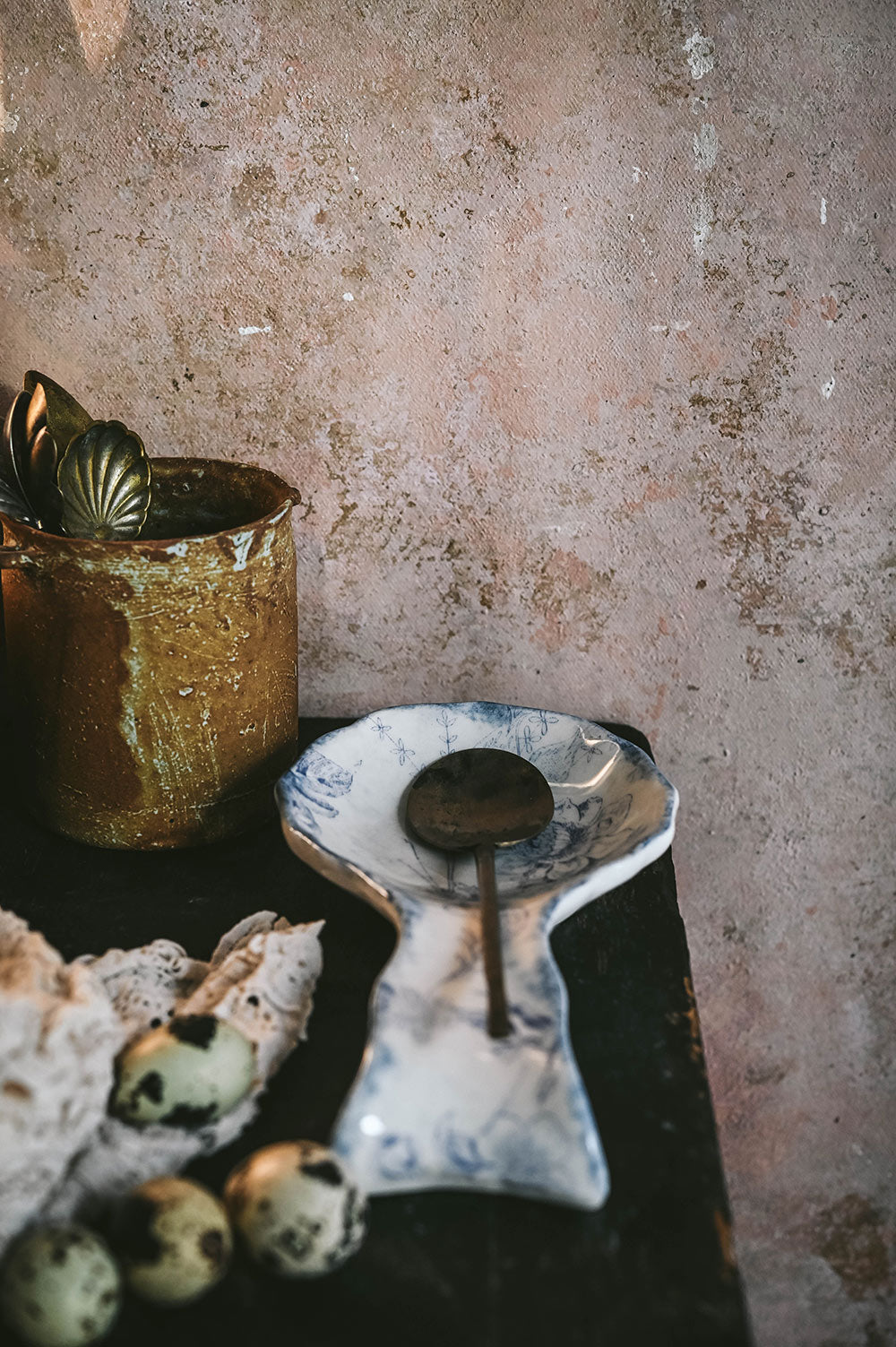The process is slow and intentional. A design is first applied by hand and fired into the ceramic. Each piece is then sponge-painted by hand, creating soft texture and variation, before a second firing brings it all together. No two are exactly alike, each one marked by the quiet imprint of the maker.