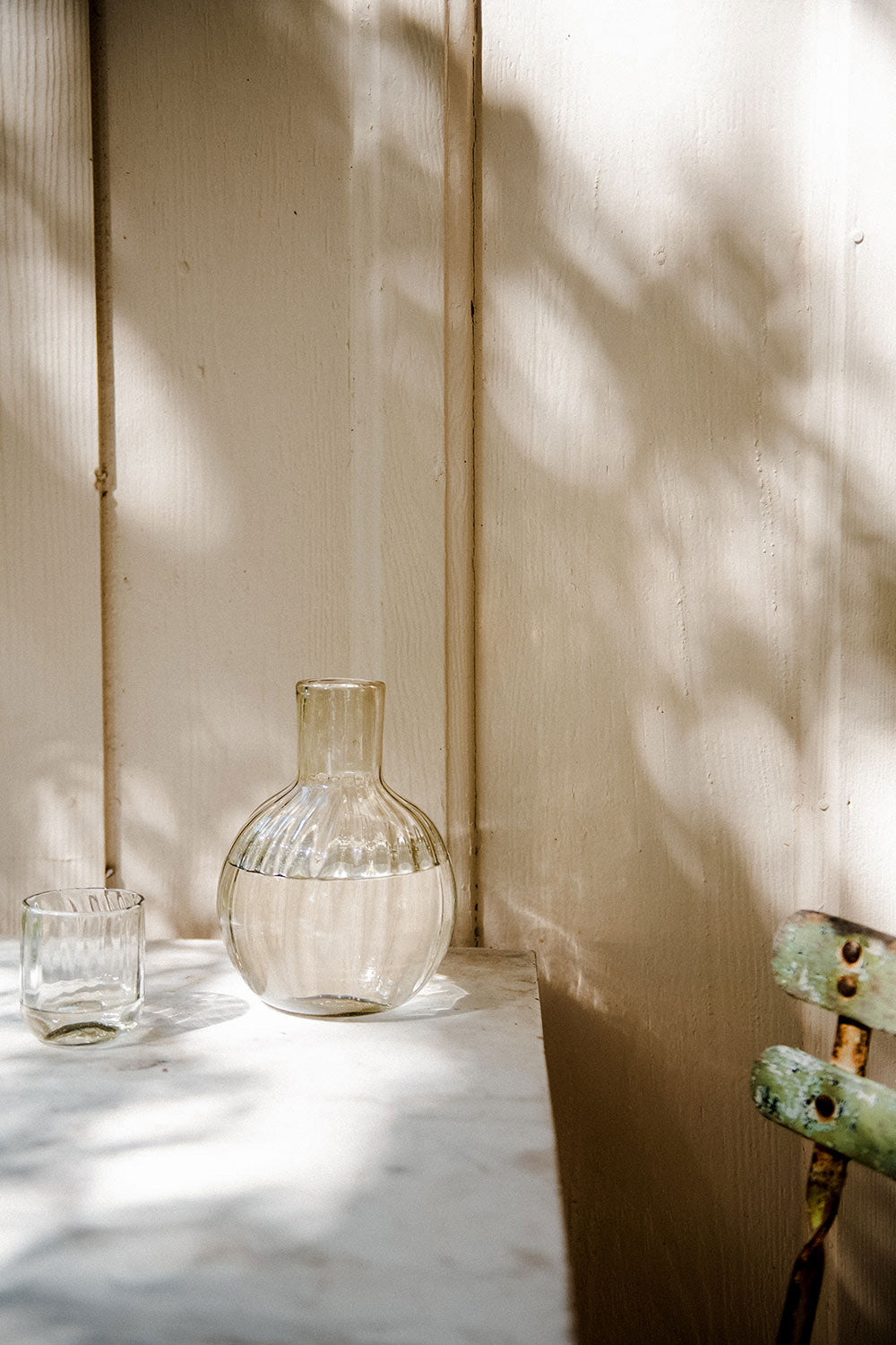 Beautifully shaped and sustainable, this carafe set is handblown from recycled glass.