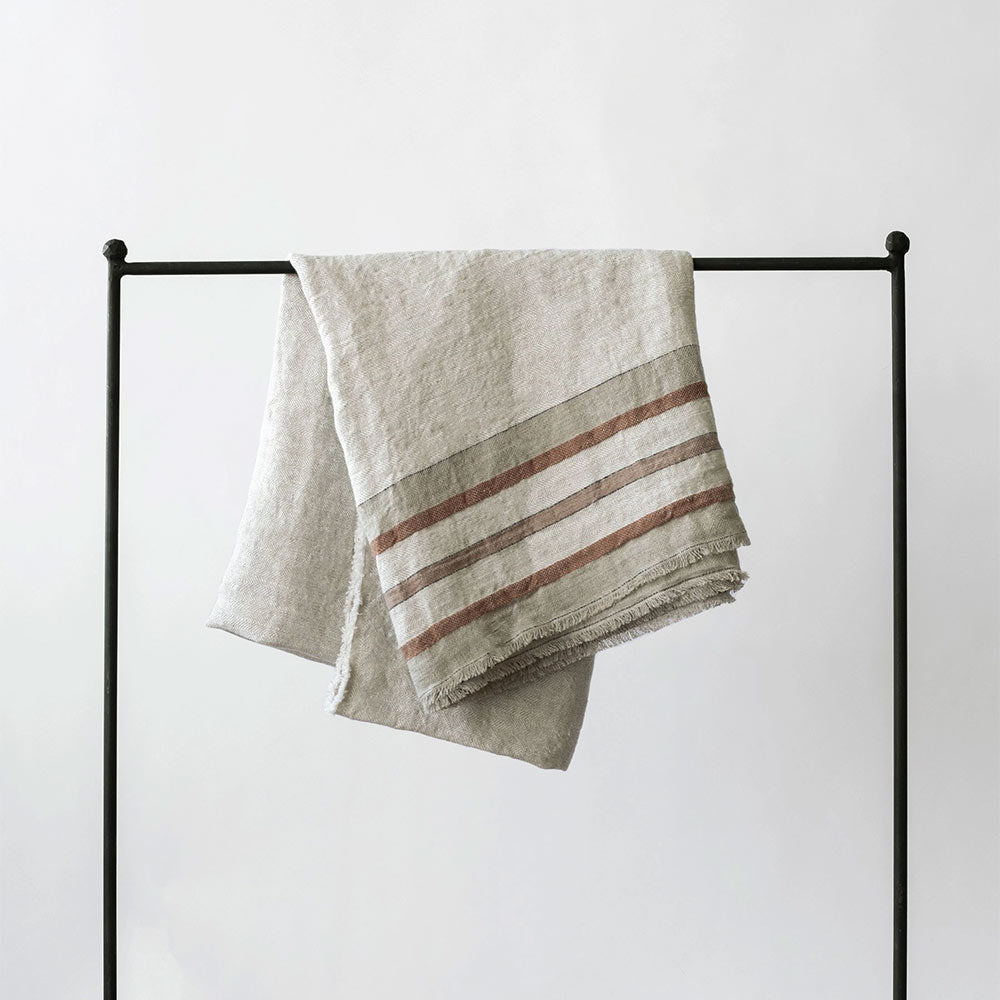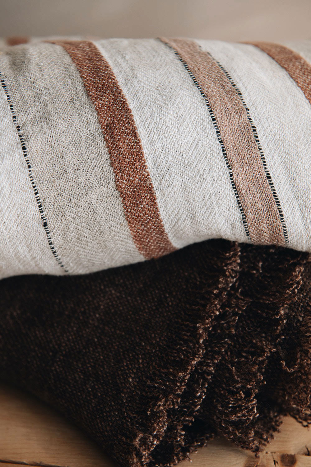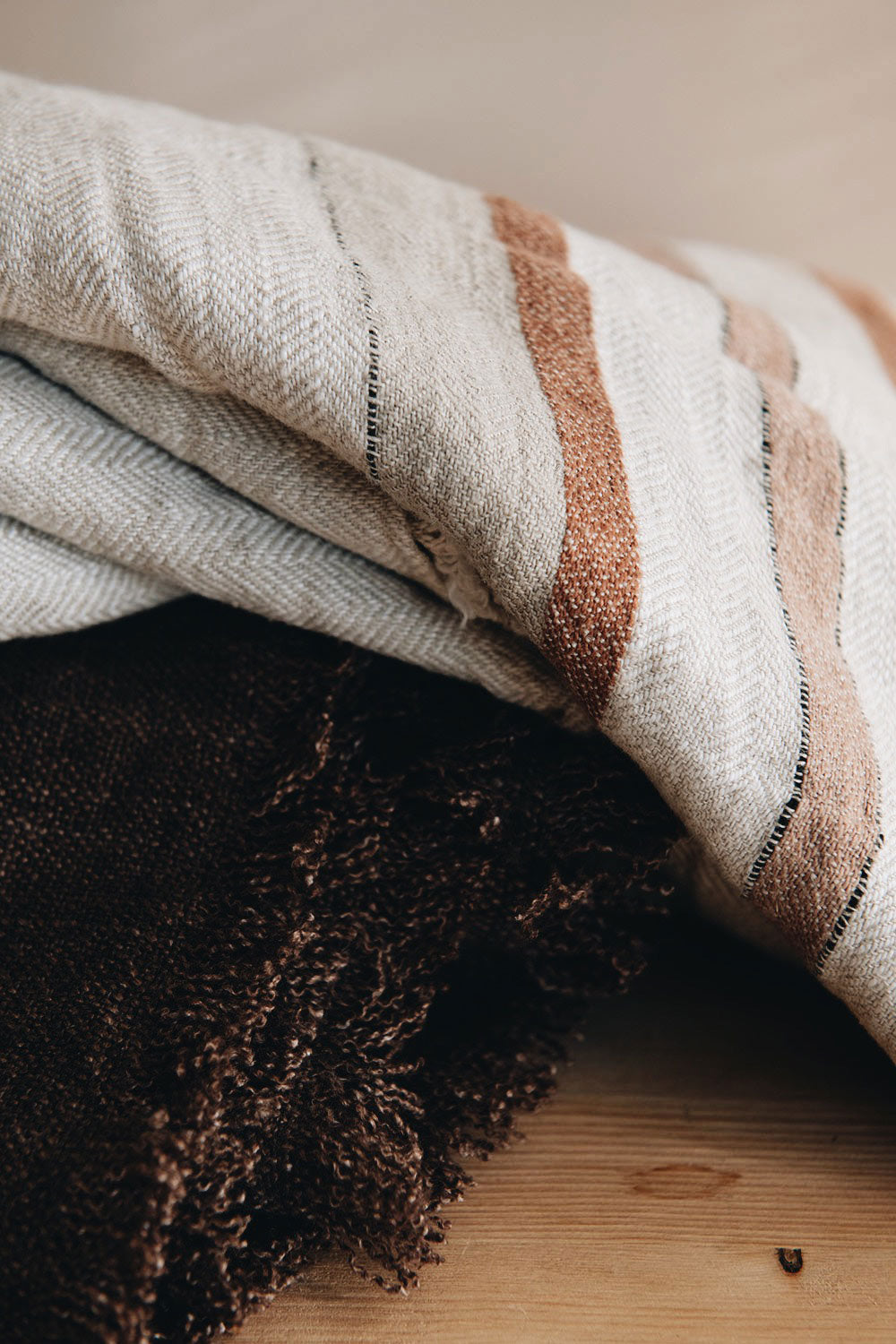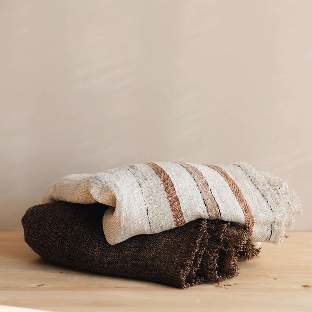 A heavy linen blanket with decorative fringes along the edges. Made from 100% linen, it is a piece that feels both enduring and elegant.